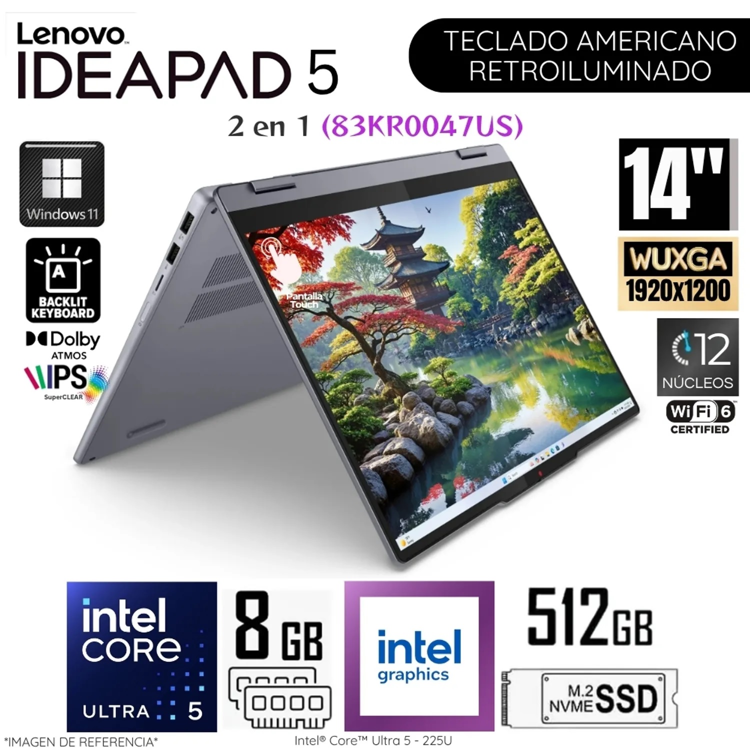Lenovo IdeaPad 5 2 en 1 – Intel Core™ Ultra 5 225U – 8GB LPDDR5X – 512GB SSD – Pantalla táctil 14″ WUXGA – Windows 11 Home – Modelo 83KR0047US